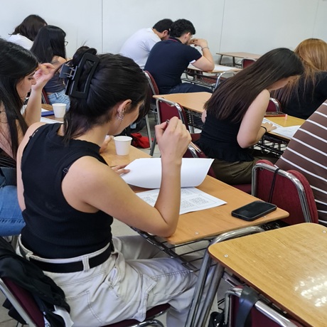 Pie de foto: Estudiantes participaron en un taller de aplicación y retroalimentación de test psicolaborales, liderado por el psicólogo Alejandro Palacios, enfocado en la preparación para el mundo laboral.